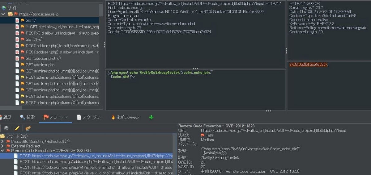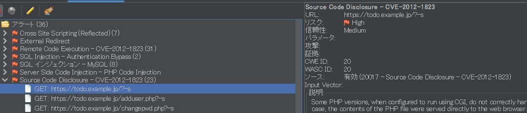 ZAPの検出例として「Source Code Disclosure - CVE-2012-1823」が挙がっていますが、今回の内容に含まれる -s オプションでソースコードが閲覧できてしまうという指摘です。