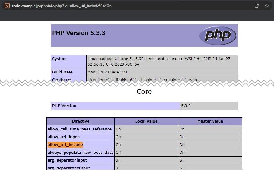 "allow_url_include On"が有効化されていることが分かります(危険な機能であるためPHP5.2.0以降ではデフォルトではOffになっているのですが、BadTodoでは初期状態でOnとなっています)。