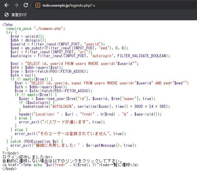 3.6 SQLインジェクション MariaDBのパスワード取得でも少し書きましたが、ソースコードが閲覧できると logindo.php → common.php と辿ってデータベースのログインID/Passが分かります。