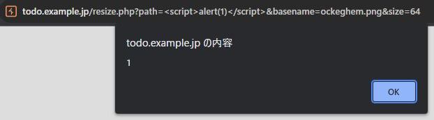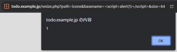 https://todo.example.jp/resize.php?path=icons&basename=ockeghem.png&size=64のpathとbasenameパラメータにXSSがあります。