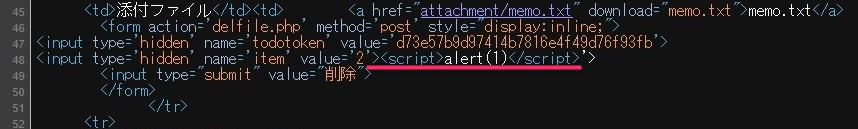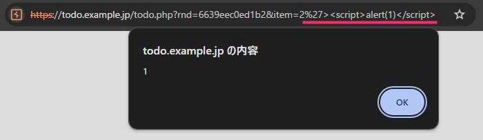 https://todo.example.jp/todo.php?rnd=6639eec0ed1b2&item=2%27%3E%3Cscript%3Ealert(1)%3C/script%3E