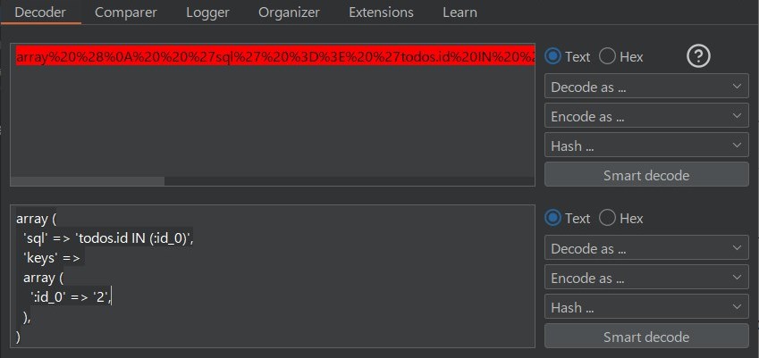 BurpのDecoderで「URLデコード」をかけるとデータベースクエリに関する配列であることがわかります。この配列そのものに問題はありません。